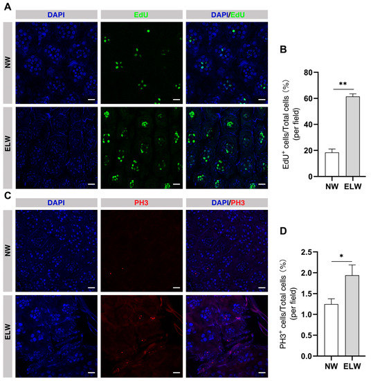 Cell proliferation is significantly increased in the midguts of ELWs. (A) Detection of cell proliferation by Click-it EdU assay in the midguts of NWs and ELWs. In all the panels except graphs, blue indicates DAPI staining, and green indicates EdU-positive cells. Scale bars, 25 µm. (B) The percentage of EdU-positive cells in the midguts of NWs and ELWs (NWs, 18.46 ± 0.87%, n = 12 intestines; ELWs, 61.49 ± 2.00%, n = 13 intestines). Means ± SEM are shown. (C) Detection of cell proliferation with PH3 antibody in the midguts of NWs and ELWs. In all the panels except graphs, blue indicates DAPI staining, and red indicates PH3-positive cells. Scale bars, 25 µm. (D) The percentage of PH3-positive cells in the midguts of NWs and ELWs (NWs, 1.25 ± 0.13%, n = 10 intestines; ELWs, 1.94 ± 0.25%, n = 12 intestines). Means ± SEM are shown. Significant differences between the midguts of NWs and ELWs were determined by Student’s t-test. Asterisks indicate significant differences between the midguts of NWs and ELWs. * p < 0.05, ** p < 0.01.