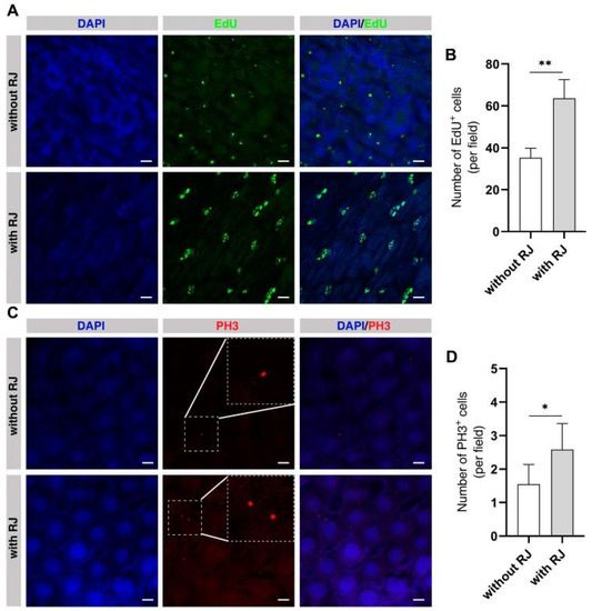 Based on the above-mentioned data, we hypothesized that in the absent queen colony the ELWs have the different nutritional status with those NWs, and autophagy is induced to recycle nutrients to sustain phenotypic plasticity. To further confirm this hypothesis, we examined the effect of the nutrients on intestinal cell proliferation by rearing honey bee larvae with RJ or without RJ in artificial food. We examined cell proliferation using EdU assay and PH3 antibody in the midguts of honey bee larvae reared with and without RJ. The body and midgut sizes of larvae reared with RJ were much larger, while those reared without RJ grew very poorly (Figure S2). The relative number of EdU-positive cells in midgut of larvae reared with RJ was significantly increased than that in the midgut of larvae without RJ (without RJ, 35.29 ± 1.21; with RJ, 67.08 ± 3.27) (Figure 6A,B). Some large positive EdU cells may be also endopolyploid in midgut of honey bee larvae. Consistently, the number of PH3-positive cells in the midgut of larvae reared with RJ was significantly increased from that in the midgut of larvae without RJ (without RJ, 1.55 ± 0.13; with RJ, 2.58 ± 0.16) (Figure 6C,D). This mimicked that of ELWs during phenotypic plasticity. These results indicated that nutritional status had important impact in cell proliferation in midgut.