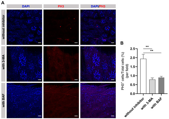 We further examined whether the above-mentioned phenotypes during plastic changes were regulated by autophagy. Autophagy can be effectively blocked by the well-known autophagy inhibitors, 3-methyladenine (3-MA, a PI3K and PtdIns3K inhibitor) and Bafilomycin A1 (BAF, a vacuolar-type H+-translocating ATPase inhibitor) [39,40]. ELWs were treated with 3-MA or BAF to inhibit autophagy. Interestingly, the percentage of PH3-positive cells was dramatically decreased in midguts with autophagy inhibition using the autophagy inhibitors compared to that in ELWs without 3-MA or BAF administration (without autophagy inhibitor, 1.94 ± 0.24%; with 3-MA, 0.79 ± 0.09%; with BAF, 0.90 ± 0.07%) (Figure 7A,B). NWs were also treated with 3-MA to inhibit autophagy. There was no obvious difference in intestinal cell proliferation of NWs treated with or without 3-MA (Figure S3). The 3-MA or BAF treatment had no or very little effect on the morphology of ovary in ELWs. Taken together, our data showed that autophagy was induced and required to sustain increased cell proliferation in the midgut of the honey bee during phenotypic plasticity changes.
