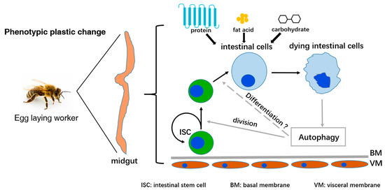 The honeybee midgut is involved in food digestion, nutrient absorption, and is responsible for immunity and detoxification [41,42]. The midgut is lined with the peritrophic matrix, which is a protective barrier. Stem cell self-renewal is known to maintain the intestinal epithelium in other insects such as Drosophila and silkworm [43,44]. In Drosophila melanogaster, intestinal stem cells (ISCs) are located adjacent to the basement membrane of the midgut epithelium [45,46,47]. In silkworm Bombyx mori, stem cell proliferation and differentiation exist in the larval, pupal and adult midgut epithelium [34,48]. The intestinal cell proliferation is abundant and showed an age-related decline in workers, queens, and drones, and queen intestinal stem cells have a relatively high replicative potential [49]. In the queen-less colony, previous studies mostly focused on the ovary reactivation of queen-less workers. Because of the essential biological function of midguts, the intestinal homeostasis of ELWs may alternate during phenotypic plasticity change. Autophagy have been confirmed to participate in multiple biological processes, but whether autophagy influenced the intestinal homeostasis of ELWs was unclear. Whether and how intestines are remodeled during ELWs phenotypic plasticity changes also remain unknown.