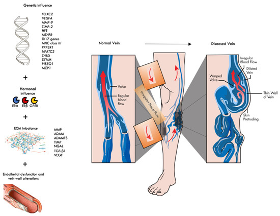 The current treatment of CVD may be medical and/or physical and/or surgical, but none of them could be considered definitely effective for patients suffering from CVD. Despite best surgical or endovascular care, recurrence following vein surgery is more than 20%, and about 25–50% of CVLUs remain unhealed after six months of adequate treatment [5,6,7]. Hence, in this area, the current interest of Precision Medicine (PM) for molecular determinants of CVD has increased in order to find molecules that could help to predict this disease and its complications and to better tailor treatment strategies and the related follow-up of patients [8,9,10]. In this comprehensive review, we examine and discuss the most up to date findings surrounding cellular, molecular, and genetic advances in determining CVD, and its progression into its main complications such as CVLUs.