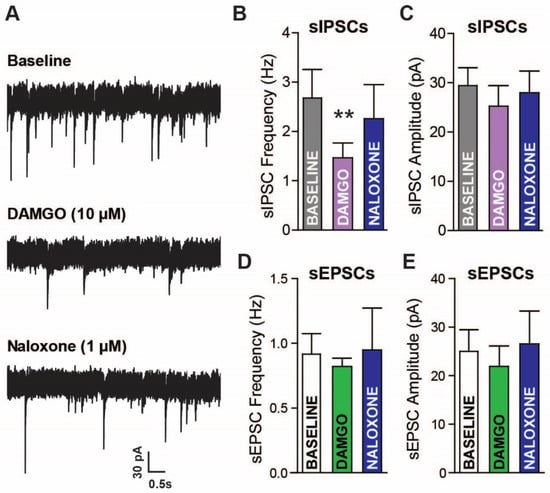 In order to establish a functional role for MORs in LPC signaling, whole cell recordings were performed in LPC neurons and the acute effects of the selective MOR agonist [D-Ala2, N-Me-Phe4, Gly5-ol]-enkephalin (DAMGO; 10 µM) were tested. The LPC neurons are thought to form highly connected intra-LPC neuron networks that modulate GABA release []. Therefore, spontaneous inhibitory postsynaptic currents (sIPSC) measurements may serve as an indirect measure of ongoing neighboring LPC neuron activity but may reflect GABA activity from other nearby GABA neurons (LPCs, BLA, or lateral amygdala). sIPSC were observed in LPC neurons and DAMGO reduced sIPSC frequency by ~46%, which was reversed by the non-selective antagonist naloxone (Figure 3A,B; 1 µM; one-way ANOVA repeated measures, F(2,12) = 7.074, p = 0.0093, with Tukey’s post hoc analysis, baseline vs. DAMGO, p < 0.01, baseline vs. Naloxone and DAMGO vs. Naloxone, p > 0.05). The sIPSC amplitude appeared unaltered by DAMGO and Naloxone (Figure 3C; p > 0.05). In contrast to the effects on sIPSCs, the spontaneous excitatory postsynaptic currents (sEPSCs) appeared unaffected by DAMGO (Figure 3D,E; p > 0.05). Since the sIPSC frequency was reduced, but not altogether silenced, by opioid application, the sIPSCs appear to come from opioid sensitive and insensitive sources. The GABAergic LPC expression of MORs indicates that the inhibition of sIPSCs by DAMGO is likely due to changes in release from local LPC neurons.