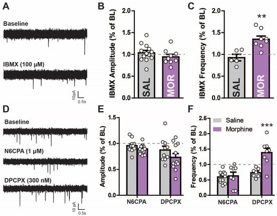 Since PDE-cAMP activity appears enhanced by prolonged morphine exposure [,], other targets sensitive to changes in adenosine tone may also be affected. Therefore, the effects of morphine exposure on Gi signaling in the non-opioid, adenosine mediated GPCR A1R were tested [] (Figure 5D–F). The sIPSC amplitude was unaltered by A1R activation (N6CPA, 1 µM) but was reduced with A1R inactivation (DPCPX, 300 nM) in both animal groups (Figure 5E; two-way repeated measures ANOVA; main effect N6CPA/DPCPX F(2,66) = 11.33, p < 0.001; main effect morphine: F(1,67) = 2.64, p = 0.119; interaction: F(2,66) = 1.44, p = 0.249). This effect was slightly, but not significantly, lower (~15%) in the morphine- compared to saline-treated mice. A1R activation reduced the frequency (Figure 5F) in both saline- (2.692 ± 0.7815 Hz to 1.833 ± 0.4712 Hz) and morphine- (0.9005 ± 0.1849 Hz to 0.4523 ± 0.0889 Hz) treated mice, which was reversed by DPCPX in saline- (~24% increase) and greater in morphine- (~121% increase) treated mice (0.4523 ± 0.0889 Hz to 1.119 ± 0.2499 Hz; two-way repeated measures ANOVA; main effect N6CPA/DPCPX: F(2,52) = 27.57, p < 0.001, main effect morphine: F(1,52) = 9.1, p = 0.007; interaction: F(2,52) = 16.33, p < 0.001). The increased activity observed in the morphine-treated mice after A1R inactivation suggests an increased adenosine tone in these animals. A1R activation-induced decreases in sIPSC frequency are probably due to the inhibition of LPC neurons through the inactivation of the cAMP cascade. The morphine-withdrawn mice have been shown to upregulate the adenylyl cyclase pathway and antagonize the A1R with DPCPX activating this pathway even further in the nucleus accumbens []. Thus, DPCPX increased the synaptic activity in the LPCs, which may be through increasing cAMP levels (since A1R is Gi coupled). However, increased activity could also be due to the DPCPX-mediated activation of silent synapses.
