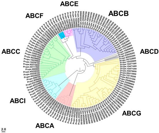 Phylogenetic analysis of ABC proteins from peach. The phylogenetic tree was constructed using the neighbor-joining method in MEGA 6.0 with 1000 bootstrap replicates. Different colors highlighted the eight subfamilies.