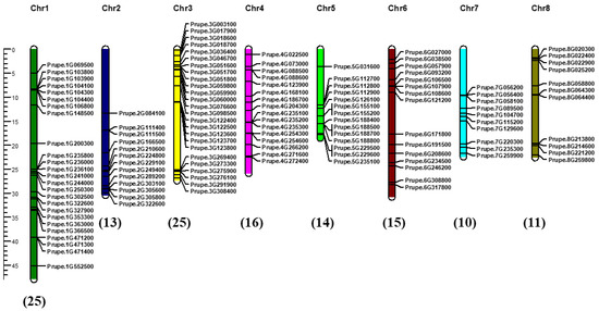Chromosomal distribution of PpABC genes. The chromosomes were visualized using MapChart program. The chromosome number is indicated at the top of each chromosome, and the number of PpABC genes in each chromosome is indicated at the bottom of each chromosome in brackets. The scale bar described the relative lengths of the chromosomes in megabases (Mb).