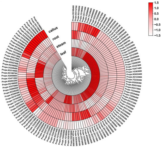 In order to further explore the expression pattern of PpABC genes in peach, transcription levels of PpABC genes in different tissues such as leaf, stem, root and callus were analyzed. A total of 119, 109, 105 and 100 PpABC genes were expressed in the leaf, stem, root and callus, respectively (Figure 3, Table S6). A total of 123 PpABC genes (accounting for 93.2% of total PpABCs) were expressed in all analyzed tissues. Among these, sixteen PpABC genes showed high expression levels (FPKM > 15) in all tested tissues. In addition, some PpABC genes presented tissues-specific expression, with 42 PpABC genes (34% of 123 expressed PpABC genes), 29 PpABC genes (24%), 27 PpABC genes (22%) and 22 PpABC genes (18%) specifically expressed in leaf, callus, root and stem, respectively. The expression of nine PpABC genes was not detected in these tissues. Overall, these results provide a baseline for the identification of various functional genes in peach.