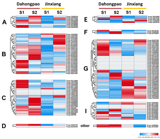 The role of PpABC genes in regulating fruit development was also investigated. The expression profiles of PpABC genes during fruit development were estimated using fruit samples of two peach cultivars, ‘Dahongpao’ and ‘Jinxiang’, which were collected at the green stage (S1) and color break stage (S2). A heatmap representing the transcript expressions of the detected PpABC genes was constructed (Figure 4, Table S7). A total of 102 PpABC genes were expressed in fruit, and 67 had an expression level over 1 (FPKM) at both developmental stages. A total of 23 PpABC genes all showed higher expression (FPKM > 15) in the S2 stage of both cultivars. Among the 23 PpABC genes, 2, 4, 6, 1, 3, 3, 1 and 3 belonged to subgroups A, B, C, D, E, F, G and I, respectively. Six PpABCC members had higher expression profiles in fruits of ‘Dahongpao’ at the S2 stage. Given that the ABCC members are reported to be related to flavonoid biosynthesis [38], these six PpABCC genes may play critical roles in anthocyanin accumulation.