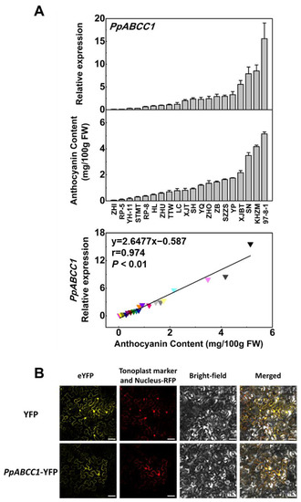 Expression and subcellular location for the PpABCC1 gene: (A) expression of PpABCC1 and anthocyanin content in ripe fruits of 20 peach cultivars and the correlation analysis between the PpABCC1 expression and anthocyanin content. Data represent means (±SD) of three biological replicates; (B) subcellular localization assay of PpABCC1 in tobacco leaves. Scale bars indicated 50 μm.