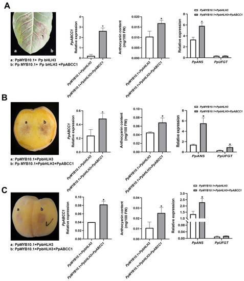 Similarly, intense red color patches appeared one week after infiltration in both the flesh and peel infiltrated with PpMYB10.1/PpbHLH3/PpABCC1 compared to these infiltrated with PpMYB10.1/PpbHLH3 (Figure 7B,C). Anthocyanin content in the flesh around the sites infiltrated with PpMYB10.1/PpbHLH3/PpABCC1 showed 1.5-fold higher as compared to that in the flesh around the sites infiltrated with PpMYB10.1/PpbHLH3. PpABCC1-overexpression significantly increased the expression of anthocyanin biosynthetic genes, PpANS and PpUFGT, by 2.9-fold and 1.9-fold higher, respectively, which correlated well with the color change in the flesh. For transient overexpression assay in the peel, anthocyanin content around the site infiltrated with PpMYB10.1/PpbHLH3/PpABCC1 showed a 1.5-fold increase compared to that around the site infiltrated with PpMYB10.1/PpbHLH3. The expression of PpANS in the peel around the site infiltrated with PpMYB10.1/PpbHLH3/PpABCC1 was 1.7-fold higher than that in the peel around the site infiltrated with PpMYB10.1/PpbHLH3, but no significant difference was observed in the expression of PpUFGT (Figure 7C). These results suggested the role of PpABCC1 in promoting anthocyanin accumulation in peach fruit.