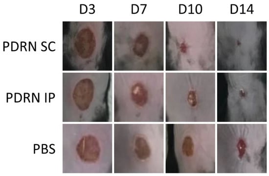 At day 0, wounds were created in a murine model of STZ-induced diabetes. At 1 and 2 days, the mice received injections of PDRN via either subcutaneous or intra-peritoneal routes. The mice of the PDRN SC group received a subcutaneous injection of PDRN in four regions on the back. In more detail, they received injections in the 3 and 9 o’clock directions at the margin of the diabetic wounds on the left and right sides of the back, respectively, once daily at a volume of 40 μL for each region. The mice of the PDRN IP group received an intra-peritoneal injection of PDRN once daily in a single dose, as previously described [].