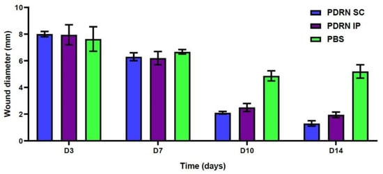 - At 14 days, the PDRN SC group showed a significantly smaller diameter of diabetic wounds as compared with the PBS group (1.3 ± 0.2 versus 5.2 ± 0.50 mm, respectively; p = 0.0002). Likewise, the PDRN IP group also showed a significantly smaller diameter of diabetic wounds as compared with the PBS group (1.95 ± 0.21 versus 5.2 ± 0.50 mm, respectively; p = 0.0036).