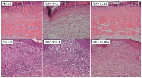 In both the PDRN SC and the PDRN IP groups, there was a marked decrease in the number of inflammatory cells at 14 days as compared with 3 days (H&E, 200×) (Figure 3).