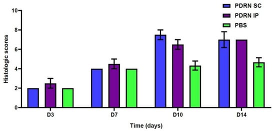 - At 14 days, the PDRN SC group had significantly higher histologic scores as compared with the PBS group (7.0 ± 0.82 versus 4.67 ± 0.47, respectively; p = 0.0248). Likewise, the PDRN IP group had significantly higher histologic scores as compared with the PBS group (7.0 ± 0.0 versus 4.67 ± 0.47, respectively; p = 0.0069).