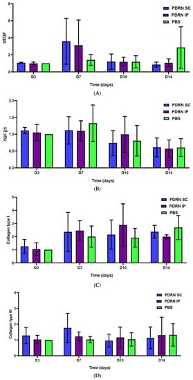 - At 7 days, the PDRN SC group showed a significantly greater expression of VEGF as compared with the PBS group (p < 0.0001). Of note, at 7 days, the PDRN SC group showed a significantly greater expression of VEGF as compared with the PDRN IP group (p < 0.0001).
