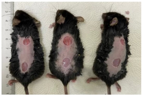 After removal of the hair on the dorsal skin of the mice using depilatory cream under general anesthesia, skin was disinfected with povidone-iodine solution and then washed with sterile water []. Two circular wounds were created on the backs of the mice using an 8mm punch and the skin was removed accordingly (Figure 6). Wound sites were disinfected with saline only because other types of disinfectants might affect their re-epithelialization [,]. Thus, oozing around wounds was removed and the adjacent region was also cleaned, but prophylactic antibiotics were not used because their use was not mandatory.