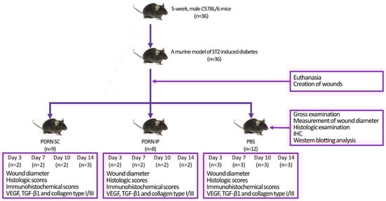 Ketamine and xylazine were mixed and then diluted at a ratio of 1/4 to set their concentration at 80 and 10 mg/kg, respectively. Then, a mixture of ketamine and xylazine was injected into the abdominal cavity and mice were euthanized accordingly []. Three mice were selected from each group, from which two tissue samples with a diameter of 12 mm, involving wounds, were obtained at 3, 7, 10 and 14 days. Of these, one tissue sample each was submitted for light microscopy and Western blotting analysis, respectively. For light microscopy, tissue samples were stained using H&E dye. Western blotting analysis was performed to identify specific proteins serving as markers of angiogenesis (e.g., VEGF and TGF-β1) and those serving as an indicator of the degree of wound recovery (e.g., collagen types I and III) [,]. An experimental schema is illustrated in Figure 7.