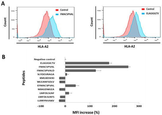 As shown in Figure 2, the binding affinity of the peptide FMACSPVAL was much higher than that of the peptide ELAGIGILTV and the peptide LLRRYNVAKV (previously reported in [21]). The % MFI increase of the peptide FMACSPVAL was 256.8%, while the % MFI increase of the peptides ELAGIGILTV and LLRRYNVAKV were 178.2% and −24.6%, respectively. The peptides FMACSPVALD, EFMACSPVAL, SLYDEVRAGA, and LMFDLSLNF had % MFI increases of 124.2%, 42.5%, 7.4%, and 15.1%, respectively. Other predicted peptides did not have a higher binding affinity than the negative control. Of the nine newly predicted binders, the most strongly predicted peptide FMACSPVAL indeed proved to be a strong binder, even stronger than the positive control. The peptide FMACSPVALD also showed robust binding. Two peptides (EFMACSPVAL, LMFDLSLNF) showed intermediate binding, and one (SLYDEVRAGA) showed binding just above the background value. It is interesting to note that EFMACSPVAL was predicted to be a strong binder by NetMHC-4.0, but only predicted to be a binder at all by one more prediction algorithm, indicating that something may be questionable with this specific NetMHC-4.0 prediction. All other peptides were non-binders in the experimental assay, including the previously published peptide LLRRYNVAKV.