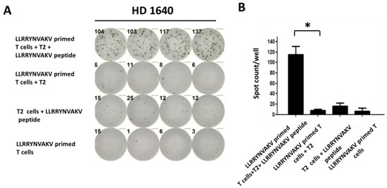 Recognition of peptide LLRRYNVAKV by T cells from a healthy donor (HD 1640). T cells from healthy donors were weakly stimulated with SOX11-derived LLRRYNVAKV-pulsed mature DCs. After two stimulation cycles, T cell cultures were detected for the activation of peptide-specific T cells. A total of 2 × 104 primed T cells were added to 1 × 105 peptide-loaded T2 target cells/well at an effector-cell-to-targeT cell ratio of 1:5. Primed T cells added to unloaded T2 cells served as a negative control group. Primed T cells and peptide-loaded T2 cells served as a background group. (A) IFN-γ ELISPOT data showing activated LLRRYNVAKV-specific T cells from one healthy donor. (B) The results are presented as the mean values of quadruplicate determinations. Mean values were calculated for each group; error bars indicate SD. Statistical significance was calculated using a paired-sample t-test and is indicated by * for p values < 0.05.