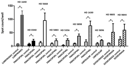 Summary of the positive peptide-specific T cell responses detected by IFN-γ ELISPOT for each healthy donor (HD). This figure shows only the positive responses of LLRRYNVAKV, FMACSPVAL, LMFDLSLNF, and SLYDEVRAGA peptide-specific T cells after a co-culture with T2 cells loaded with the respective peptides. Peptide-specific T cells co-cultured with unloaded T2 cells were considered as a negative control. The spots were counted, and the results were considered positive when the spot count was at least twice as high as that of the negative control. Mean values were calculated for each group; error bars indicate SD. Statistical significance was calculated using a paired-sample t-test and is indicated by * for p values < 0.05.