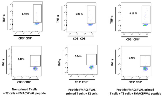 Intracellular flow cytometry staining (HD 3026, E:T ratio 1:10) primed with peptide FMACSPVAL. The ability of FMACSPVAL-specific CD8+ T cells to secrete the cytokines IFN-γ and TNF-α after stimulation was evaluated by intracellular flow cytometry staining. A non-primed T cell group and unloaded T2 cell group served as negative controls. Exemplary flow cytometry plots of positive responses are shown. Percentages of IFN-γ+ and TNF-α+ cells after peptide-stimulation were analyzed and compared with negative control samples. T cells were gated on CD3+ CD8+ cells.