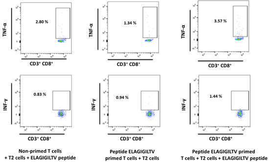 Intracellular flow cytometry staining (HD 3026, E:T ratio 1:10) primed with peptide ELAGIGILTV. The ability of ELAGIGILTV-specific CD8+ T cells to secrete the cytokines IFN-γ and TNF-α after stimulation was evaluated by intracellular flow cytometry staining. Exemplary flow cytometry plots of positive responses are shown. T cells were gated on CD3+ CD8+ cells.