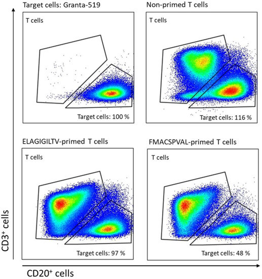 Granta-519 cells were irradiated (100Gy) and co-cultured with FMACSPVAL-primed T cells, ELAGIGILTV-primed T cells, or non-primed T cells as a negative control. Cells were co-cultured at an effector:target ratio of 2:1 for 24 h. Samples were harvested and spiked with a defined number of polystyrene beads (Life Technologies Corporation, Eugene, OR, USA) to quantify cell numbers by flow cytometry. Cytotoxicity was assessed by determining the number of viable Ganta-519 cells in the presence of T cells relative to that in the absence of T cells.
