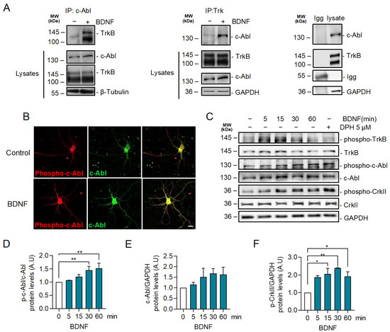 2.2. BDNF Increases c-Abl Activation and the Interaction of TrkB with c-Abl