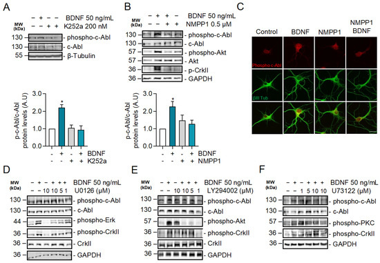 c-Abl activation induced by BDNF is dependent on the activity of TrkB receptors but does not require PI3K, ERK1/2, and PLC-γ-dependent signaling pathways. (A) Seven DIV neurons treated with BDNF in the presence or absence of K252a (200 nM). Phospho-c-Abl (Tyr-412), c-Abl, Phospho-CrkII (Tyr221), Phospho-Akt (Ser473), Akt, and GAPDH levels were analyzed by western blot. Densitometric quantification is shown below. The data corresponds to 3 independent experiments. Statistical analysis corresponds to ANOVA and Tukey post-test (B) Seven DIV neurons derived from TrkBF616A mice were stimulated with BDNF in the presence or absence of 0.5 µM 1NM-PP1. Phospho-c-Abl (Tyr-412) and Phospho-CrkII (Tyr221), Phospho-Akt (Ser473), Akt, and GAPDH levels were evaluated by western blot. The data corresponds to 3 independent experiments. Statistical analysis corresponds to ANOVA and Tukey post-test (* p = 0.0213). (C) Seven DIV neurons from TrkB F616A mice were treated with BDNF in the presence or absence of 1NM-PP1. Representative images of immunofluorescence against Phospho-c-Abl (Tyr-412) in red and βIII tubulin in green. Scale bar = 10 µm. (D) Seven DIV rat primary hippocampal neurons treated with BDNF in the presence or absence of the MEK1/2 inhibitor U0126 (1, 5 and 10 µM). Phospho-c-Abl (Tyr-412), c-Abl, Phospho-CrkII (Tyr221), CrkII, Phospho-Erk1/2 (Thr202/Tyr204), and GAPDH levels were analyzed by western blot. n = 3. (E) Seven DIV rat primary hippocampal neurons were pretreated with 5 µM PI3K/Akt inhibitor, LY294002, for 60 min, and then stimulated with 50 ng/mL of BDNF for 30 min. Phospho-c-Abl (Tyr-412), c-Abl, Phospho-CrkII (Tyr221), CrkII, Phospho-Akt (Ser473), and GAPDH levels were analyzed by western blot. n = 3 (F) Seven DIV rat hippocampal neurons were pretreated with 5 µM PLC-γ inhibitor, U73122, for 60 min, and then stimulated with 50 ng/mL of BDNF for 30 min. Phospho-c-Abl (Tyr-412), c-Abl, Phospho-CrkII (Tyr221), Phospho-PKC (Thr-538), PKC, and GAPDH levels were analyzed by western blot. n = 2.