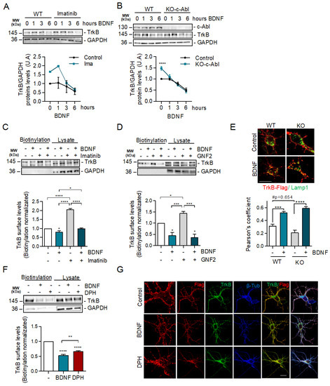 c-Abl activation downregulates basal surface TrkB levels but does not affect exogenous BDNF-induced TrkB endocytosis. (A) Seven DIV rat hippocampal neurons were treated with 5 µM Imatinib for 1 h, and then stimulated with 50 ng/mL of BDNF for 0, 1, 3, and 6 h. Protein extracts were immunoblotted for TrkB and GAPDH levels. The data corresponds to 4 independent experiments. (B) Seven DIV hippocampal neurons from c-Abl knockout mice (c-Ablloxp/c-Ablloxp; Nestin-Cre+) (c-Abl-KO) were treated with 50 ng/mL of BDNF for different amounts of time (1, 3, and 6 h). Lysates were analyzed by western blot for c-Abl, TrkB, and GAPDH. The data corresponds to 3 independent experiments. Statistical analysis corresponds to a two-way ANOVA, Sidak’s post-test (WT Control/KO Control **** p < 0.0001). (C,D) Rat primary hippocampal neurons (7 DIV) were pre-treated for 1 h with c-Abl inhibitors, and then treated with 50 ng/mL BDNF for one hour. Cell surface proteins were labeled by NHS-SS-biotin before initiation of TrkB internalization by BDNF at 37 °C for 30 min. Proteins on the surface were precipitated by streptavidin followed by western blot analysis using TrkB and GAPDH antibodies. The data corresponds to 3 independent experiments. (C) Representative immunoblot of cell surface TrkB receptor after 50 ng/mL BDNF and/or 5 µM Imatinib treatment. Densitometric quantification of TrkB levels showed an increase of TrkB levels on the plasma membrane in presence of Imatinib, but no differences were detected after BDNF stimulus. Statistical analysis corresponds to one-way ANOVA, Tukey’s post-test (Control/BDNF * p = 0.0317; Control/IMA and BDNF/IMA **** p < 0.0001; BDNF/IMA + BDNF * p = 0.0376). (D) Representative immunoblot of cell surface TrkB receptor after 50 ng/mL BDNF and/or 5 µM GNF2 treatment. Densitometric quantification showed a significant increase of TrkB levels on the plasma membrane in presence of GNF2, but no differences were detected after BDNF stimulus one-way ANOVA, Tukey’s post-test (Control/BDNF * p = 0.0263; Control/GNF2 * p = 0.117; BDNF/GNF2 *** p = 0.0007; GNF2/BDNF + GNF2 *** p = 0.0004). (E) Mouse primary hippocampal neurons (5 DIV) were transfected with TrkB-Flag. After 2 days of incubation, neurons were starved for 1 h. Then, neurons were washed and incubated with an anti-Flag antibody for 20 min at 4 °C. The cells were then treated with 50 ng/mL BDNF for 3 h. Subsequently, neurons were fixed and immunostained with anti-Lamp1. Quantification of colocalization between the TrkB signaling endosomes and lysosomes shows a decrease in control c-Abl KO neurons, but BDNF treatment abolished this difference. The data corresponds to 5 independent experiments. Two-way ANOVA, Turkey’s post-test (*** p = 0.004; **** p < 0.0001; # p = 0.0654). Scale bar = 10 μm (F) Representative immunoblot of cell surface TrkB receptor after 50 ng/mL BDNF or 5 µM DPH treatment. Densitometric quantification of TrkB levels in the plasma membrane showed that DPH treatment induces TrkB receptor internalization. The data corresponds to 3 independent experiments. Statistical analysis corresponds to one-way ANOVA, Tukey’s post-test (Control/BDNF and Control/DPH **** p < 0.0001; BDNF/DPH ** p = 0.0086). (G) Hippocampal neurons of 5 DIV were transfected with TrkB-Flag. After 2 days of transfection, neurons were incubated with anti-Flag antibodies (red) at 4 °C for 20 min. TrkB internalization was stimulated with 50 ng/mL BDNF or 5 µM DPH at 37 °C for 30 min and then the neurons were fixed, permeabilized, and immunostained with anti-TrkB (green) and β-tubulin (blue). Images were acquired on a confocal microscope. Scale bar = 10 μm.