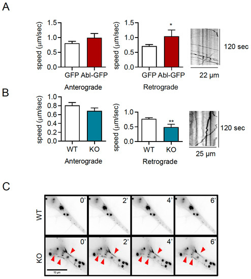 Studies have established that the post-endocytic trafficking of TrkB vesicles is required for dendritic arborization, by increasing local signaling in dendrites and synapses [37,38,44,45,46]. To study the effect of c-Abl on TrkB post-endocytic vesicular trafficking, hippocampal neurons were co-transfected with a c-Abl-GFP construct to overexpress c-Abl and TrkB-mCherry. Then, live cell imaging was performed to assess the anterograde and retrograde speed of TrkB-mCherry moving vesicles. The quantification of the vesicular transport speeds showed that c-Abl overexpression increased the speed of TrkB vesicles moving in the retrograde direction but had no effect on anterograde speed (Figure 6A). To confirm that c-Abl affects TrkB vesicular velocity, c-Abl-KO neurons were transfected with TrkB-mCherry fusion protein, and the same analysis of live cell images was performed. Interestingly, the retrograde speed of TrkB-mCherry fusion protein was significantly reduced in c-Abl knockout neurons as compared to wild-type neurons (Figure 6B). In addition, when analyzing the TrkB-m-Cherry vesicles transfected in c-Abl-KO neurons, we observed TrkB vesicles with elongated and tubular shapes, different from the circular morphology of the vesicles in WT neurons. (Figure 6C). Taken together, analysis of TrkB vesicle trafficking suggests that c-Abl activity is required for an efficient retrograde TrkB transport rate in neurites.