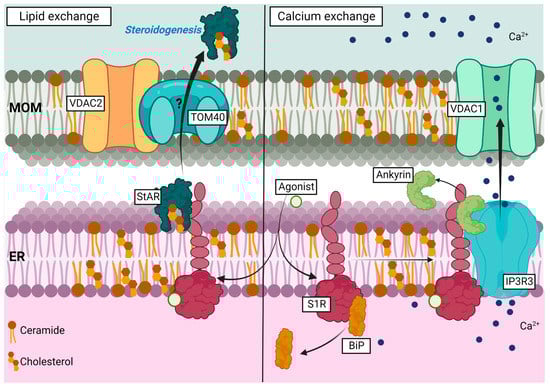 Representation of S1R role in lipid and calcium exchanges observed in lipid raft at the MAM. Left side; agonist-induced activity of S1R promotes its interaction with StAR and supports cholesterol exchange between ER and mitochondria through interaction with VDAC2 and potentially TOM40, which enhances steroidogenesis. Right side: Upon agonist-binding, S1R dissociates from BiP and associates with IP3R3. S1R binding to IP3R3 promotes Ankyrin protein dissociation’s from IP3R3 and supports calcium exchange from the ER to mitochondria. MOM (mitochondria outer membrane).