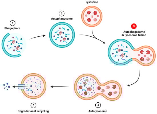Summary of autophagy process. (1) Nucleation of the phagophore. (2) Elongation and maturation of the phagophore into an autophagosome. (3) Autophagosome fusion with lysosome. S1R seems to be involved in this step. (4) Formation of the autolysosome. (5) Degradation and recycling of the autolysosome contents.