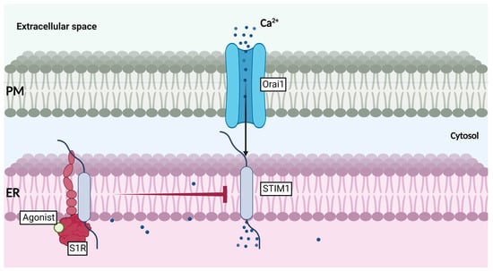 Many studies have observed and reported S1R translocation to the ER-PM junctions upon agonist-binding (reviewed in [,]). In fact, S1R is known to affect the expression and stabilization of many receptors, such as ion channels, kinases, GPCRs (G Protein-Coupled Receptors), and integrins (review in []). This wide range of interacting partners allows S1R to act as a very potent modulator of cellular excitability, adhesion, growth, inflammation, and signaling. Moreover, S1R was also shown to inhibit store-operated Ca2+ entry (SOCE) through association with STIM1 (Stromal Interaction Molecule 1), an ER-Ca2+ sensor regulating SOCE []. Indeed, it was demonstrated that evoked Ca2+ release, with ER stressors such as thapsigargin, carbachol, ionomycin, or cyclopiazonic acid (CPA), was reduced in HEK 293 cells stably expressing S1R, when compared to WT (wild type) cells. These results suggested that ER calcium level was lower in S1R stable cells. Interestingly, upon Ca2+ restoration, S1R cells showed a reduced ability to replenish their intracellular Ca2+ concentration. Likewise, these observations were reproduced using S1R agonist SKF-10047. However, S1R antagonist (BD-1047) and S1R depletion using small interfering RNA (siRNA) showed opposite effects, i.e., it enhanced extracellular calcium reuptake. Of note, S1R depletion highly decreased Orai1 expression, while increasing STIM1 expression level. In this study, the authors confirmed the S1R interaction with STIM1 by using co-immunoprecipitation assay, confocal microscopy, and AFM, and showed that agonist stimulation enhanced S1R association to STIM1 and that S1R-STIM1 complex was translocated to ER-PM junctions upon Ca2+ store depletion. Once at the ER-PM, S1R binding to STIM interfered with Orai1-STIM1 association and hence, reduced SOCE activity (Figure 5) []. These data unveiled that S1R is not only able to modulate calcium homeostasis between ER and mitochondria, but it can also control the cell’s ER Ca2+ concentration and Ca2+ reuptake after a prolonged stress period. The siRNA experiments performed also offered a hint regarding S1R effect on Orai1 expression. Although shown to associate with Orai1, S1R’s impact on the Ca2+-channel stability and expression at the PM remains to be clarified. Interestingly, another study using breast cancer cell line (MDA-MB-435s) and colorectal cancer cells (HCT-116) also reported that S1R activation (with Igmesine) was reducing extracellular calcium reuptake in a SK3-dependent manner, most likely by inhibiting Orai1 translocation in DRMs. Most importantly, disruption of calcium signaling was later found to impair cancer cell migration []. Briefly, S1R can promote the cell survival pathway by supporting ER-mitochondria exchange, and is likely able to protect cells from a Ca2+ overload through SOCE regulation at the ER-PM junctions. These findings suggest that S1R can prevent hyperactivation of Ca2+-operated enzymes, and most likely regulate cell migration and hyperexcitability (reviewed in []).