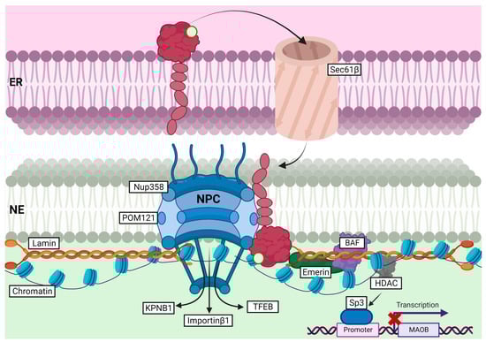 Very few studies have investigated the functions of S1R at the NE. An original study on this subject showed that upon agonist exposure, i.e., (+)-pentazocine and cocaine, S1R was able to translocate from ER-LD to NE in NG108 cells []. S1R localization at the NE was further supported by an electron microscopy study showing S1R mainly located at the NE in mouse retinal neurons (including photoreceptor, bipolar, and ganglion cells) []. Later, it was established that upon cocaine stimulation, S1R translocation to NE enabled it to recruit chromatin-remodeling components, including Emerin, Lamin A/C, BAF (barrier-to-autointegration factor), and HDAC (histone deacetylase). Recruitment of these components was found to repress MAOB (monoamine oxidase B) gene expression through association with the transcription factor Sp3 (specific protein 3), in NG108 and Neuro2a cells (Figure 6) []. Interestingly, S1R modulation of gene transcription and mRNA translation was also described in neurons of dorsal root ganglia (DRG) in a spare nerve injury model of neuropathic pain []. In this study, the authors proposed that S1R translocation from ER to NE is supported by Sec61β, a transport protein mainly residing at the ER (Figure 6). Once at the nucleus, S1R was shown to interact with c-Fos and to bind 4E-BP1’s promoter, thereby enhancing its expression and indirectly reducing Cav2.2 mRNA translation through inhibition of eIF4E [].