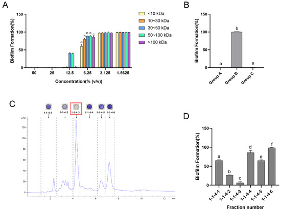 As the pH environment of the eluent cannot be well controlled in the subsequent separation, to further study the influence of pH, we tested the antibiofilm ability of the fraction weighing less than 10 kDa with different treatments. As shown in Figure 2B, in Group A, the fraction weighing less than 10 kDa in the CFS can inhibit 99.7% of biofilm formation at its original pH value (pH = 3.7). However, it lost its inhibitive effect when the pH was adjusted to 6.5 (Group B). Interestingly, when the pH was returned to the original value (Group C), the antibiofilm effect also recovered, with a 99.6% inhibition of biofilm formation, which was not significantly different from Group A (p > 0.05). These results indicate that the influence of pH on the antibiofilm ability of the active substance was reversible.