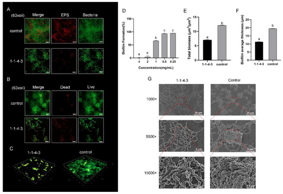 Antibiofilm effect of component 1-1-4-3. (A–C) Confocal laser scanning microscopy (CLSM) images of biofilm of S. mutans in the absence and presence of 1-1-4-3: (A) Green signal indicates microorganisms, whereas red signal indicates exopolysaccharides (EPSs). (B) Green signal represents live bacteria and red represents dead bacteria; (C) 3D structure of the biofilm. Scale bar: 10 µm. (D) Effect of dose on the antibiofilm ability of 1-1-4-3. (E,F) Total biomass and biofilm average thickness of S. mutans biofilm in 1-1-4-3 and control group. (G) Scanning electron microscopy (SEM) images of biofilm of S. mutans in the absence and presence of 1-1-4-3. Microstructure was observed and red boxes at low magnification were enlarged to a higher magnification. Different superscript letters for different values denote statistically significant differences (p ≤ 0.05).