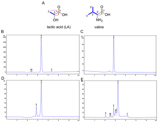 The 1H NMR and 13C NMR spectra of 1-1-4-3 showed two groups of resonance signals with a ratio of 2:1, which indicated that 1-1-4-3 was a mixture (Figures S9 and S10). Next, the two groups of high and low signals were analyzed. One secondary methyl (δH 1.22, d, (J = 6.9 Hz); δC 21.0 (CH3)), an oxygenated methine (δH 4.02, q, (J = 6.9 Hz); δC 66.3 (CH)) and one carbonyl (δC 176.9 (C)) were distinguished in the group with high signals in the 1H NMR, 13C NMR and DEPT spectra (Figures S11 and S12). The 1H–1H COSY correlation between the protons at δH 1.22 (H-3) and the proton at δH 4.02 (H-2) (Figure S13), as well as the HMBC correlations between H-3 and H-2 and the carbonyl (δC 176.9, C-1) (Figure S14), suggest that the secondary methyl, the oxygenated methine and the carbonyl were connected to form the structure of LA (Figure 4A). The quasimolecular ion peak at m/z 89.0244 (calcd. for C3H5O3− [M − H]− 89.0244) in the HR-ESI-MS further supported the presence of LA as a major constituent in 1-1-4-3. As for the low-signal group, the 1H NMR, 13C NMR and DEPT spectra displayed characteristic signals for two secondary methyls (δH 0.89 and 0.93, each d, (J = 7.0 Hz); δC 18.1 and 19.3 (each CH3)); two methines, including a nitrogenated one (δH 3.12, d, (J = 3.6 Hz); δC 59.9 (CH)); and a carbonyl (δC 170.0 (C)). As shown in Figure 4A, the observed 1H–1H COSY correlations between H-2′/H-3′ and H-3′/H-4′(H-5′) indicated the moiety of CH-2′–CH-3′(–CH3-5′)–CH3-4′, which was linked to the carbonyl (δC 170.0, C-1′) by the key HMBC correlation between H-2′ and C-1′. Therefore, the component with low content was determined to be valine, whose molecular weight was also consistent with the HR-ESI-MS ion peak at m/z 118.0863 (calcd. for C5H12NO2+ [M + H]+ 118.0863). In addition, the 1D NMR and HPLC analysis of the authentic samples, LA and valine, as well as an analysis of their mixture (LA and valine at a ratio of 2:1), were also performed. By comparing the 1D NMR data (Table 1 and Figures S15–S22) and HPLC spectra (Figure 4B–E) of 1-1-4-3 with those of LA, valine, and their mixture, it was further confirmed that 1-1-4-3 contained LA and valine.