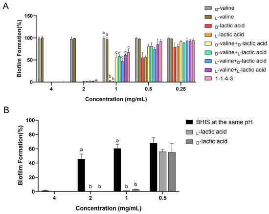 Verification of the role of LA in antibiofilm activity. (A) Antibiofilm effect of 1-1-4-3, valine (d/l-), LA (d/l-) and the mixture of valine and LA. (B) Antibiofilm effect of LA and BHIS at the same pH as LA at each concentration. The data are presented as the means ± SD. Different superscript letters for different values denote statistically significant differences (p ≤ 0.05).