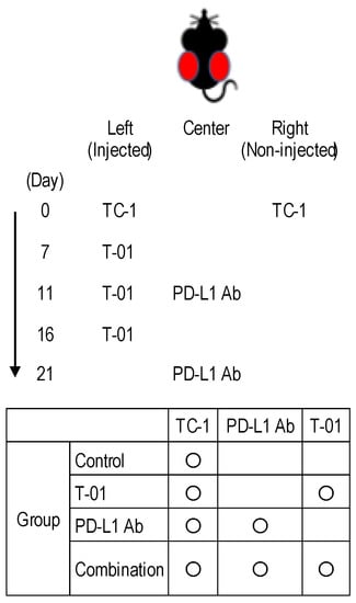 Five-week-old female C57BL/6 mice (15–18 g) (CLEA Japan Inc., Tokyo, Japan) were used in protocols approved by the Committee on the Ethics of Animal Experiments (CEAE) at Iwate Medical University. In the TC-1 model, 1 × 105 cells in 0.1 mL PBS were subcutaneously injected bilaterally in the flank of C57BL/6 mice. Animals received an intratumoral dose of 1 × 105 PFU of T-01 suspended in 50 µL of PBS 7, 11 and 16 days after TC-1 injection. Rat anti-mouse PD-L1 monoclonal Ab (subclass: IgG2b, clone: 10F.9G2, Bio Legend Inc., San Diego, CA, USA) was used as an immune checkpoint inhibitor. Anti-PD-L1 Ab was injected subcutaneously between the left and right tumors 11 and 21 days after TC-1 injection. The antitumor effect in the mouse model of cervical cancer was investigated in the following four groups: control group, T-01 group, PD-L1 Ab group, and combination group. The T-01 and combination groups were administered T-01 to the tumor on the left side. The PD-L1 Ab group and combination group were administered anti-PD-L1 Ab subcutaneously between the left and right tumors. The control group was administered PBS to the tumor on the left side. T-01 or PBS were administered intratumorally at 4- to 5-day intervals starting on day 7 after TC-1 implantation. Anti-PD-L1 Ab was administered subcutaneously between the dorsal tumors 11 and 21 days after TC-1 inoculation. The anti-PD-L1 Ab was administered at a dose of 100 μg/100 μL per inoculation (Figure 1). Tumor volumes were calculated using the formula V = ½ L × W2, where L is the length (longest dimension) and W is the width (shortest dimension) [].