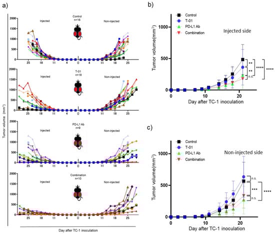 Efficacy of T-01 in combination with PD-L1 inhibition in a murine bilateral subcutaneous TC-1 tumor model. (a): Individual tumor growth curves of T-01 tumors. (b): Growth of TC-1 tumors in the T-01-injected side in animals. The results are presented as the mean ± SD (n = 9–18 per group) (** p < 0.01, *** p < 0.001, **** p < 0.0001 n.s.: not significant). (c): Growth of TC-1 tumors in the non-injected side in animals. These results are presented as the mean ± SD (n = 9–18 per group) (** p < 0.01, *** p < 0.001, **** p < 0.0001 n.s.: not significant).