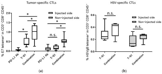 Tumor-specific and HSV-specific CTLs in bilateral subcutaneous TC-1 tumors treated with the combination of T-01 and anti-PD-L1 Ab. Thirteen days after tumor implantation, tumors were harvested and characterized for the presence of E7-specific CD8+ T-cells and HSV- specific CD8+ T-cells using E7-specific tetramer and HSV gB tetramer staining followed by flow cytometry analysis. (a): Tumor-infiltrating E7-specific CD8+ T-cells were analyzed by flow cytometry. (b): Tumor-infiltrating HSV-specific CD8+ T-cells were analyzed by flow cytometry. The results are presented as boxplots, which display the dataset based on the five-number summary: minimum, maximum, sample median, and the first and third quartiles (n = 8 per group). A two-way ANOVA followed by Sidak’s multiple comparisons test was used to determine statistical significance (* p < 0.05, n.s.: not significant).