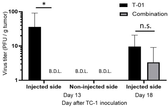 We quantified T-01 virus levels in tumor tissues of the T-01 and combination groups (Figure 4) at days 13 and 18. Day 13 is 2 days after the second virus administration and 2 days after the anti-PD-L1 antibody administration. Day 18 is 2 days after the third virus administration and 7 days after the an-ti-PD-L1 antibody administration. On the injected side, the titer of T-01 was significantly higher in the T-01 group than in the combination group at day 13 (T-01 vs. combination = 35.8 PFU/g vs. below detection limit, p < 0.05). Comparatively, the titer of T-01 on the non-injected side was below the detection limit in both the T-01 and combination groups at day 13 (Figure 4). Moreover, the titer of T-01 on the injected side decreased on day 18 compared to day 13. There was no significant difference between the combination and T-01 groups at day 18 (T-01 vs. combination = 9.6 vs. 3.0 PFU/g, not significant) (Figure 4).