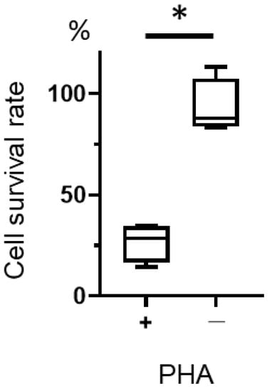 Cytotoxicity of T-01 against activated lymphocytes. Lymphocytes were isolated from the spleens of naïve mice, cultured in the presence or absence of PHA, and then infected with T-01. Cell survival was assayed 24 h after infection. The results are presented as boxplots, which display the dataset based on the five-number summary: minimum, maximum, sample median, and the first and third quartiles. The Student’s t-test was used to determine statistical significance (* p < 0.05). The experiments were performed four times. These data are the mean of 4 experiments.
