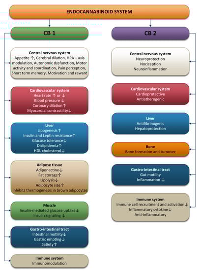 The ECS also has an important role in the maintenance of immune homeostasis. Immune cells, especially immune B cells, followed by monocytes, natural killer cells, neutrophils, and CD4 and CD8 lymphocytes, express ECS receptors. CB2 receptors are 10–100 times more present at this level [,,]. Both CB1 and CB2 receptors are important modulators of the immune system, inducing immunosuppression [].