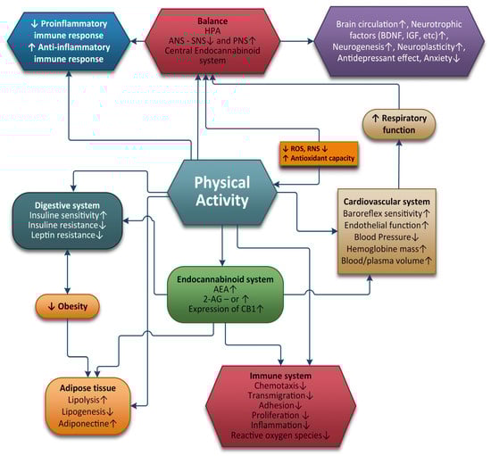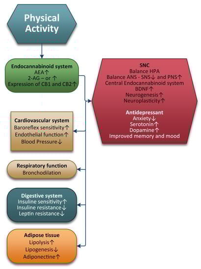 Figure 2 shows the positive effects that physical activity has on different systems and organs and on the ECS.