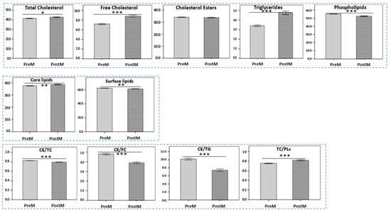 HDL lipid components and their ratios in the study groups (mean ± SD). PreM: premenopausal women; PostM: postmenopausal women. * p < 0.05; ** p < 0.01; *** p < 0.001: compared to the premenopausal group.