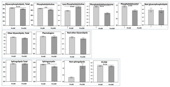 As shown in Figure 3, the profile of individual GPLs and SLs in postmenopausal females was different from that recorded for premenopausal females. The percentages of PC, SM, PE, and PI were significantly lower in the postmenopausal group compared to the premenopausal (31.21 ± 2.71 vs. 33.43 ± 1.09, p < 0.01, 6.18 ± 1.25 vs. 7.02 ± 0.66, p < 0.01, 0.77 ± 0.22 vs. 1.18 ± 0.11, p < 0.001 and 1.11 ± 0.33 vs. 1.42 ± 0.21, p < 0.001, respectively), whereas lysoPC and the rest SLs were significantly higher (3.65 ± 0.91 vs. 2.93 ± 0.31, p < 0.001 and 1.16 ± 0.78 vs. 0.33 ± 0.18, p < 0.001, respectively). No statistically significant differences were observed in the FA pattern of HDL lipids between the two groups, apart from a significant decrease in the percentages of LA and DHA in postmenopausal females compared to premenopausal (Table S6).