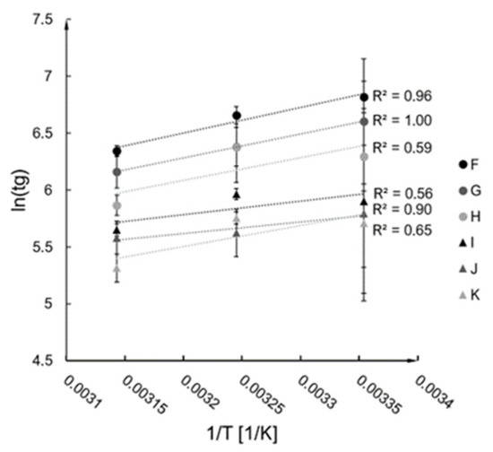 Activation energy and constant were established based on the conducted measurements of gelation time for A–F syntheses for the chosen temperatures (described in Section 4.1). The results were plotted in form and presented in Figure 2, along with the fitted linear trendlines (R2 values are presented in the graph). According to the linearisation of the Arrhenius equation (Equations (1) and (2)), the trendline constants allowed for an estimation of the and values for the investigated syntheses (presented in Figure 3).