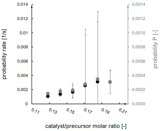 These values were a basis for the probability parameter designation (according to the interpretation of the Arrhenius equation), which is an equivalent of an effective collision probability value and the primary model parameter within the presented research. The probability rate was designated directly based on the Arrhenius equation, while probability was multiplied by the time step value (characteristic for each synthesis) (Equation (4)). The probability and probability rate dependence on the catalyst/precursor molar ratio are shown in Figure 4.