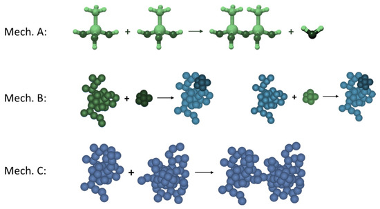 These approaches can be implemented via different models of computation, depending on the chosen scale (Figure 1), such as the Monte Carlo method [46], molecular dynamics (reactive, coarse-grained) [1,36,37,38,47,48,49], population balance [50] and cellular automata. The last one is rarely applied for gelation description [42], though is more common for investigating mechanical behaviour [51,52]. However, cellular automata are used for many processes concerning aggregation due to diffusion (possibly with chemical reaction) [53], such as recrystallisation [54] or flocculation [55].
